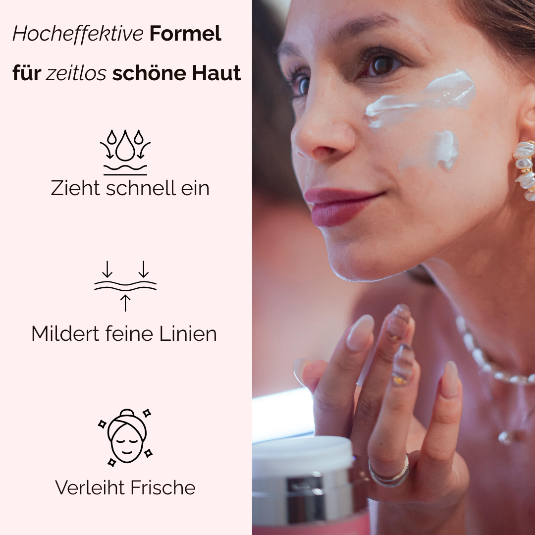 Unsere leistungsstarke Anti-Aging-Creme kombiniert fünf der wirksamsten Wirkstoffe in optimaler Konzentration für maximale Ergebnisse: