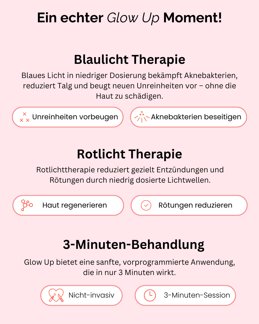 Mit der einzigartigen Technologie von Glow Up bekämpfen Sie Hautunreinheiten effektiv und schonend. Unsere spezielle Therapie hilft, Akne nachhaltig zu reduzieren und Ihre Haut zu beruhigen – für ein selbstbewusstes, strahlendes Aussehen.