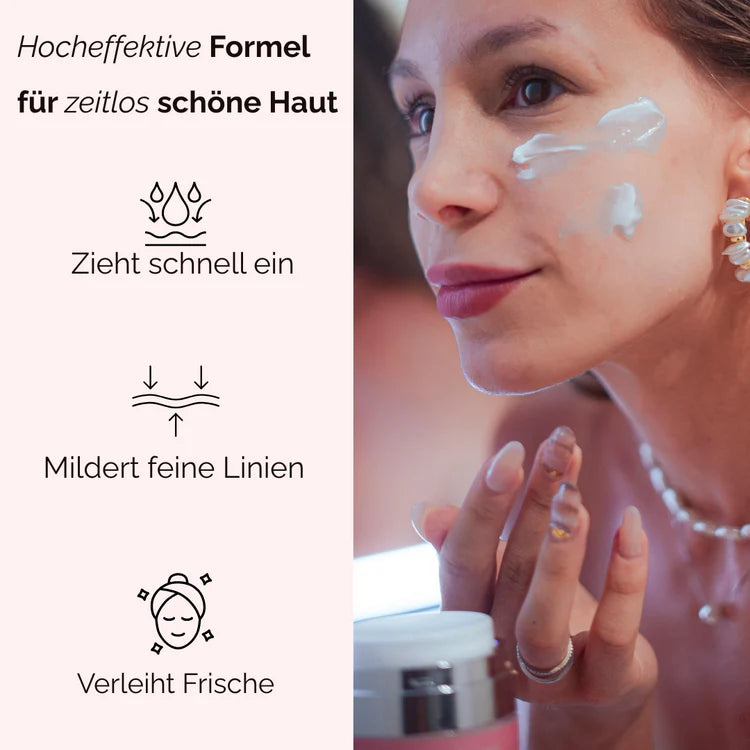 Hochwertige Inhaltsstoffe wie Kollagen und Hyaluronsäure wirken zusammen, um feine Linien zu reduzieren, die Haut zu straffen und den Teint sichtbar zu glätten.