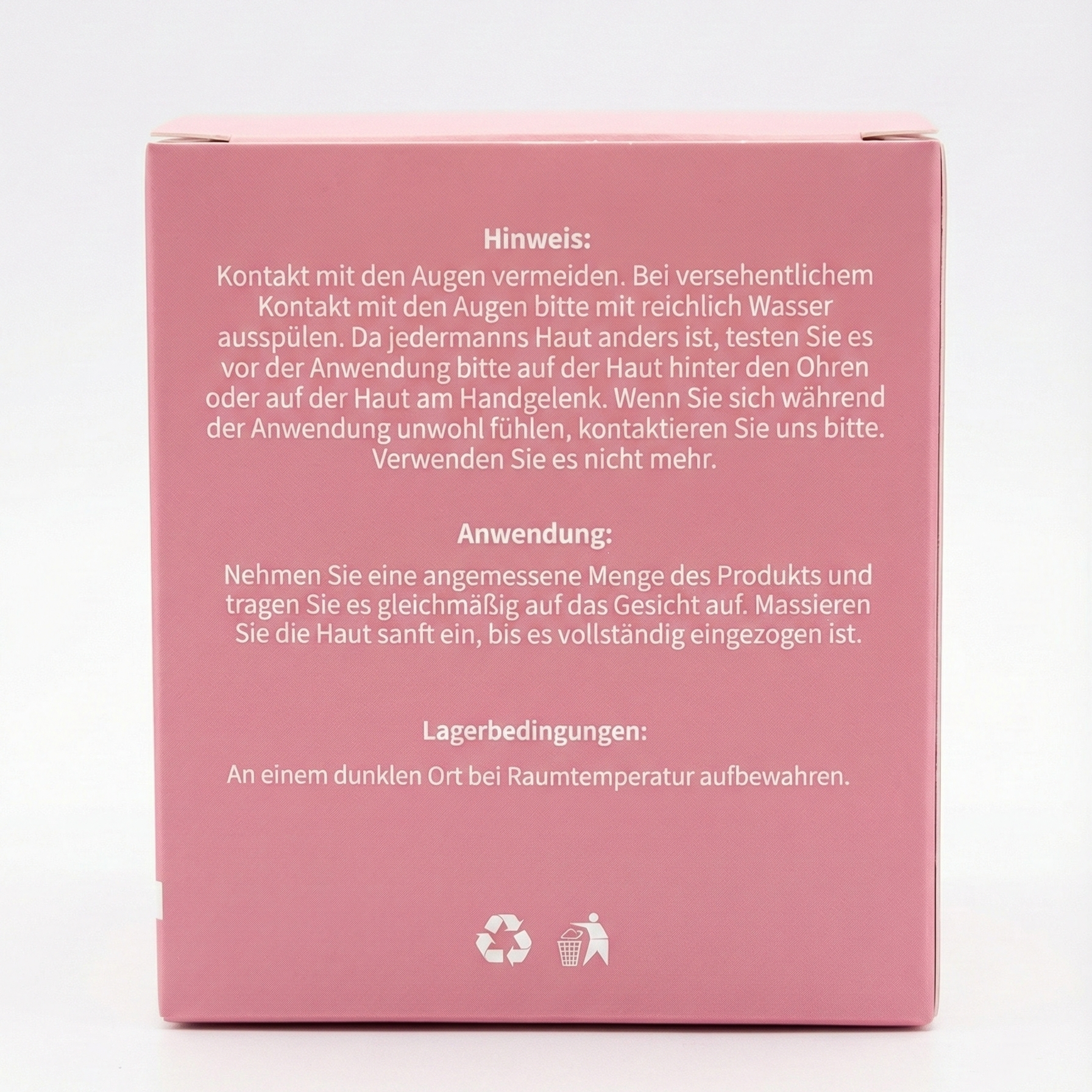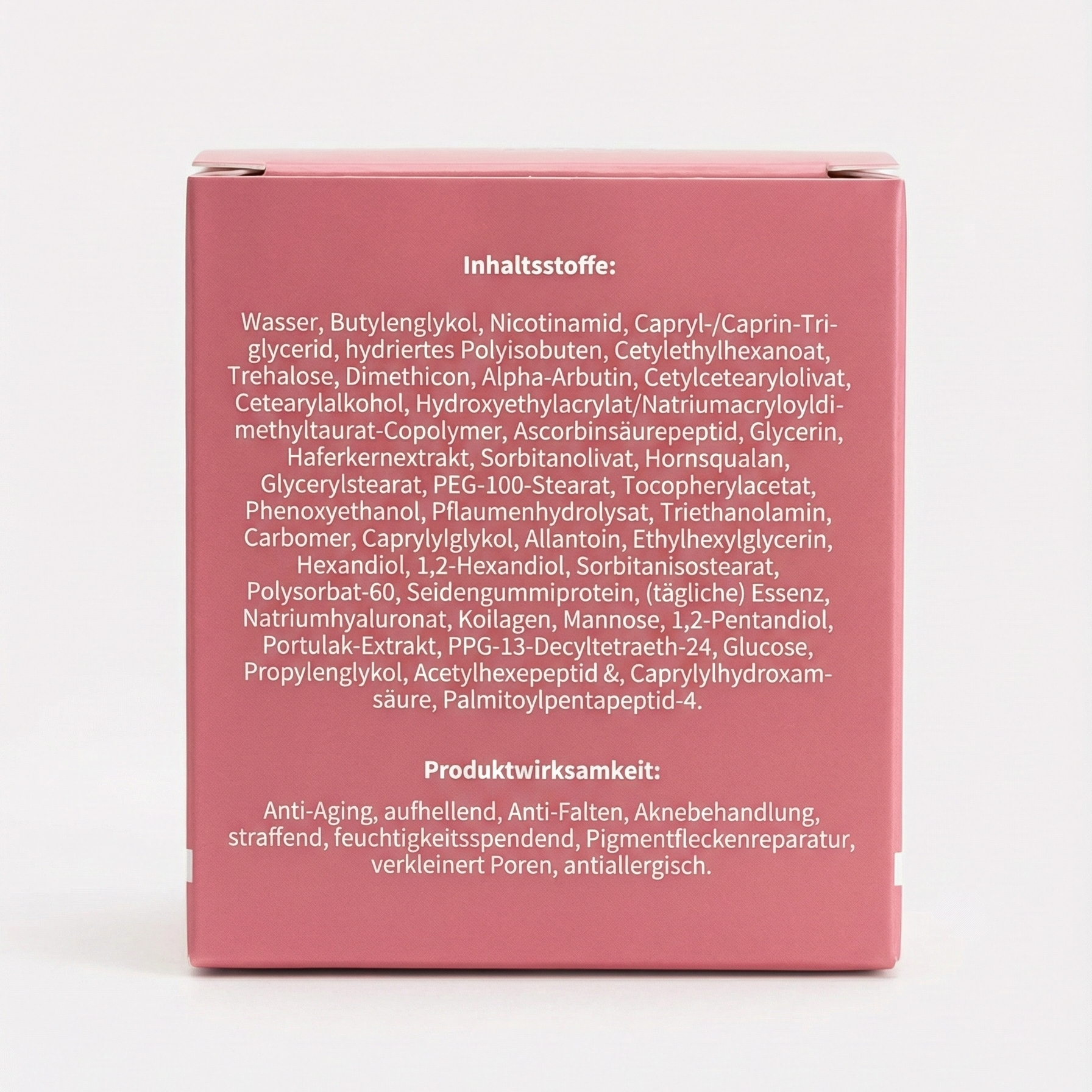 Auf der Verpackung geben wir ehrlich den Anteil der hochwertigen Rohstoff-Komplexe an, die wir in die Creme mischen (z.B. 20% Vitamin-C-Lösung oder 10% Kollagen-Fluid). Diese Komplexe sorgen dafür, dass die Wirkstoffe stabil bleiben und Ihre Haut sofort an der Oberfläche pflegen, ohne sie zu reizen.