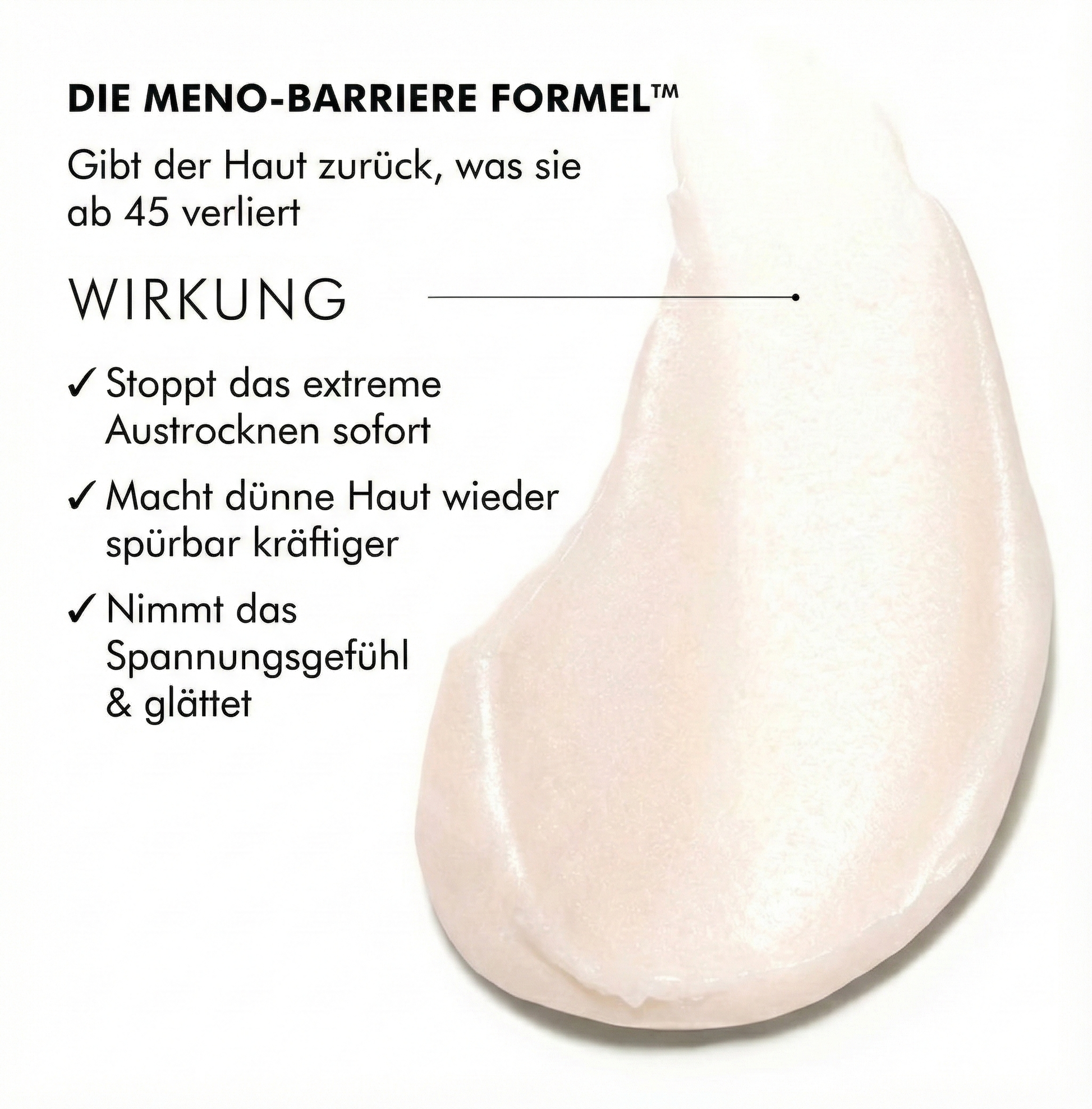 Die Meno-Barriere Formel™ ist eine fortschrittliche Spezialpflege für hormonell veränderte Haut, die den strukturellen Abbau ("Pergament-Effekt") und unregelmäßige Pigmentierung bekämpft. Diese biomimetische Technologie führt der Haut exakt die Lipide und Schutzfaktoren zurück, die durch sinkende Hormonspiegel fehlen. Basierend auf klinisch erprobten Wirkstoffen, die nachweislich die Barriere versiegeln, Flecken aufhellen und die natürliche Hautdichte wiederherstellen.