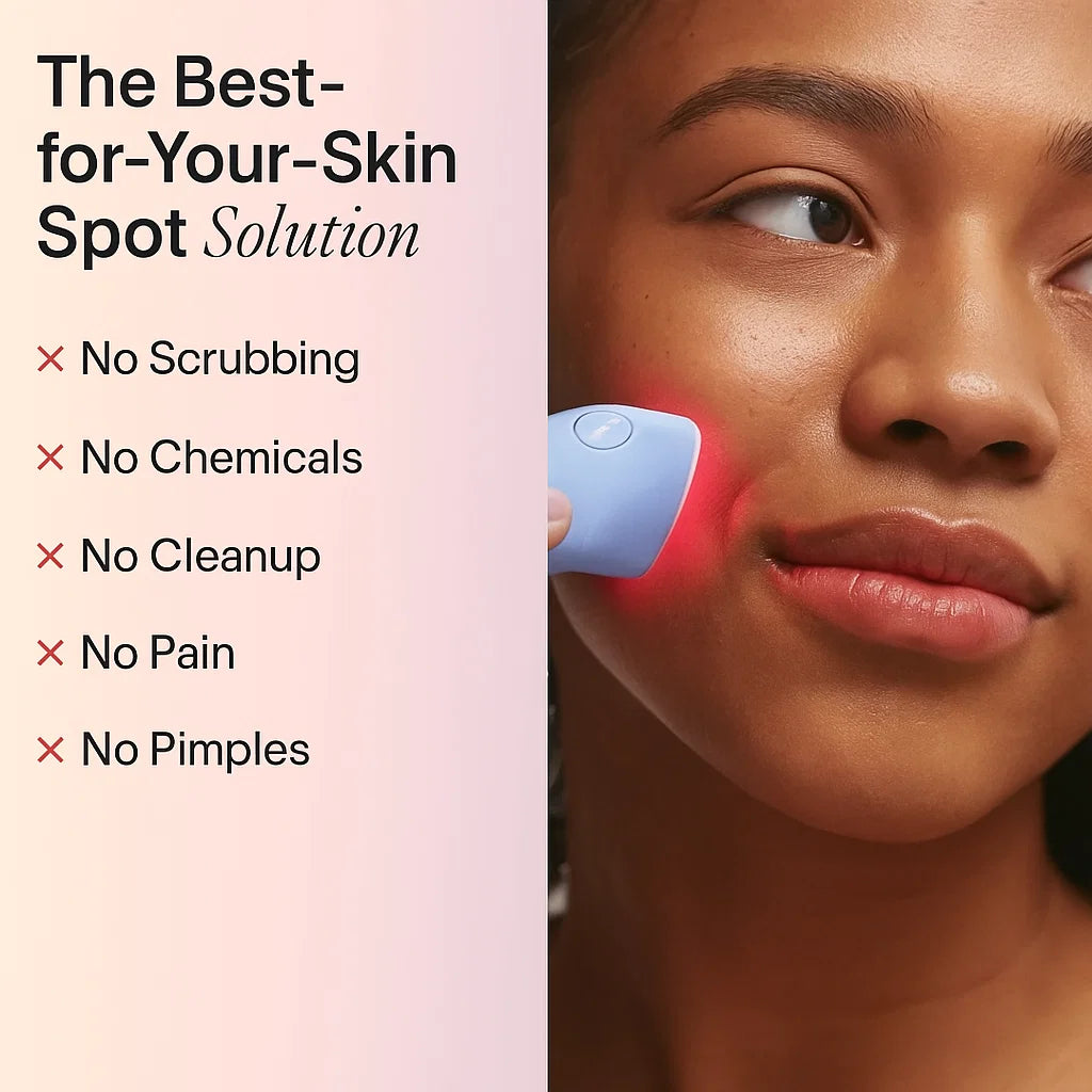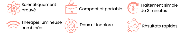 Thérapie par lumière bleue – La technologie de lumière bleue basse fréquence pénètre profondément dans la peau et cible spécifiquement les bactéries responsables de l'acné. Parallèlement, elle régule la production de sébum pour prévenir les futures poussées d'acné.