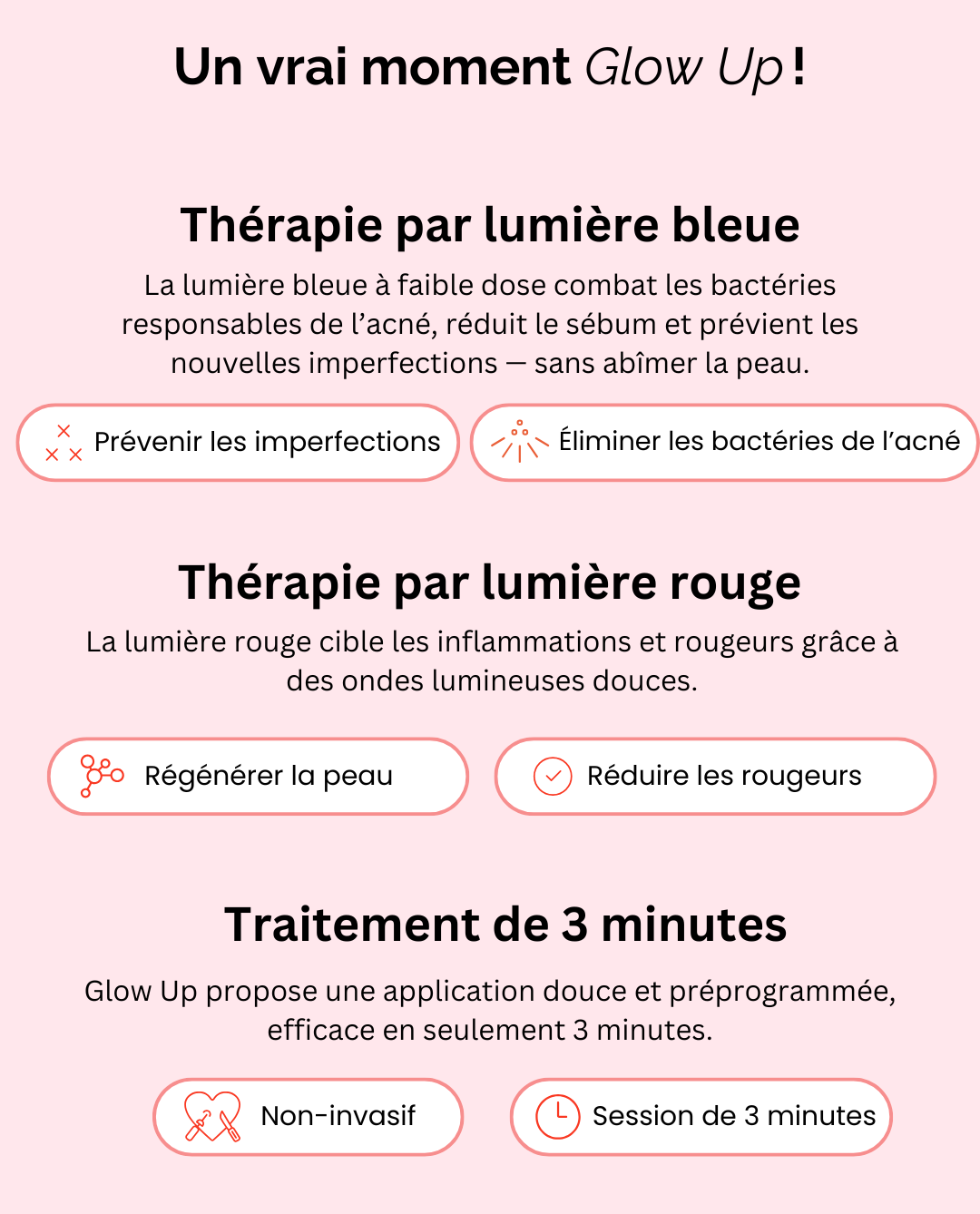 En tant que dermatologue, je vois un grand potentiel dans Glow Up . Son association de luminothérapie bleue et rouge cible efficacement les bactéries responsables de l'acné tout en réduisant l'inflammation et en favorisant la cicatrisation cutanée. Rapide, non invasif et facile à utiliser, c'est un complément judicieux à toute routine de soins.